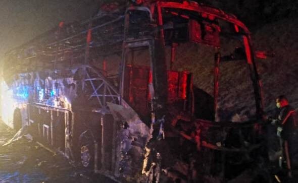 “Saat kami tiba di lokasi, bus ini ditemukan 100 persen terbakar setelah menabrak sepeda motor yang jatuh tadi di lokasi kejadian,” ujarnya dalam keterangannya di sini.