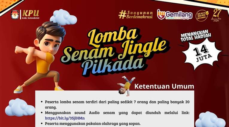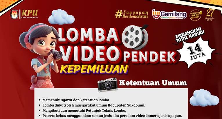 sukabumiNews, KAB SUKABUMI – KPU Kabupaten Sukabumi mengadakan Lomba Video Pendek tentang Kepemiluan dan Senam Jingle Pilkada dengan total hadiah Rp 14 Juta, Ini Syarat dan Ketentuannya;