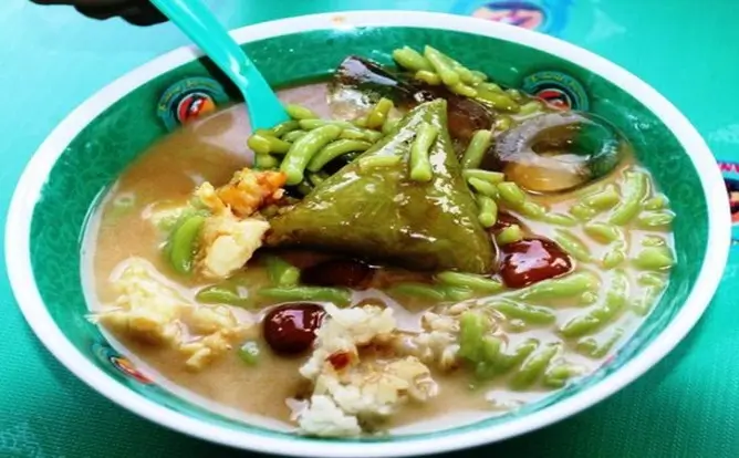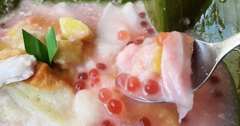 Minuman ini berisikan ketan merah, ketan biasa, tape, candil, dan lupis. Semuanya dipadukan dengan santan, gula merah cair, serta cendol yang saling melengkapi.