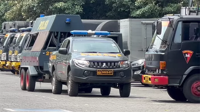 Petugas bersiaga di depan gerbang. Beberapa sarana prasarana pengamanan demonstrasi juga disiapkan kepolisian.
